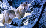 «Белый волк в снежном лесу среди елей»